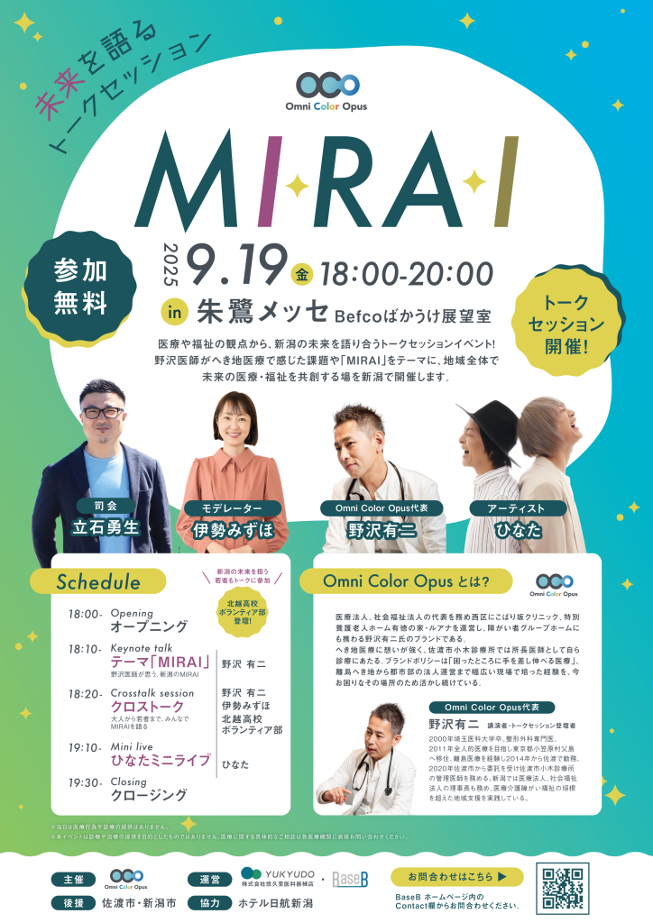 お知らせ 未来を語るトークセッション 「MIRAI」に関する 打合せ・お問い合わせについて 2025年09月03日 更新 トークセッション「MIRAI」(2025年9月19日開催予定)に関する打合せ・ご質問は、当サイトの「お問い合わせ」フォームまたは公式「LINE」にて受け付けております。